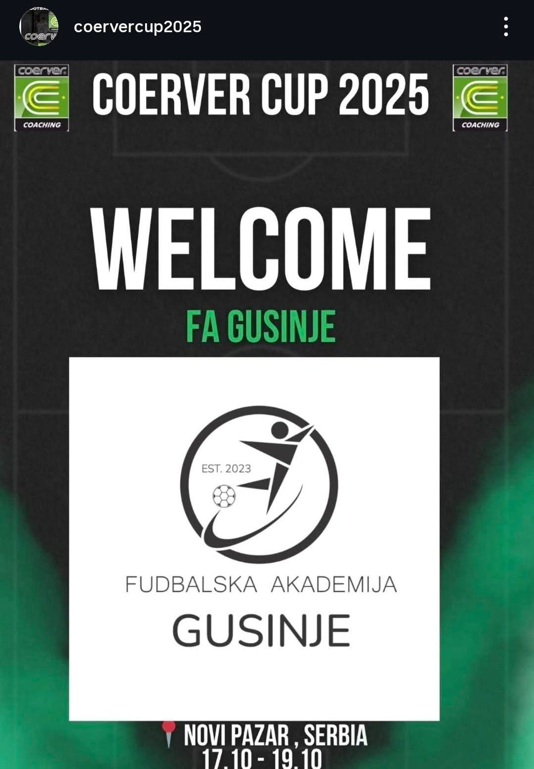 Predstojećeg vikenda Fudbalska akademija (FA) Gusinje 2023 učestvovaće na prestižnom međunarodnom turniru „Coerver Cup 2025“, koji se održava u Novom Pazaru u organizaciji renomirane Coerver akademije.